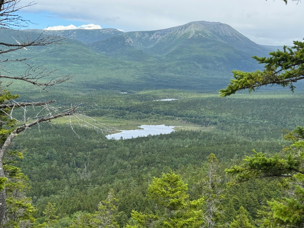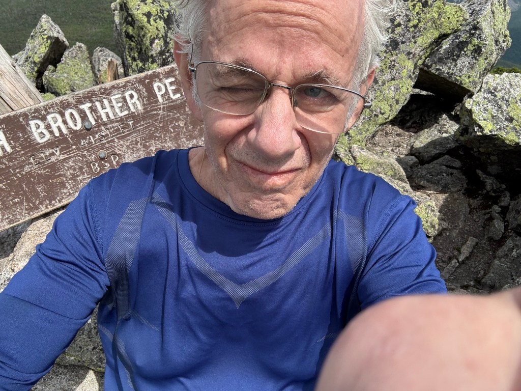 It was going to be a hot day, in the mid-80s, and humid, the type of weather that persuaded me not to hike a year ago. But I have more mountains on my quest. I will start early in the morning. I ask two different AI platforms for directions from Mountain View Motel to the Bigelows, and I get contradictory directions, one telling me north, one telling me south. I get one of the AI platforms to agree with the other, I guess AIs can be bullied too, and end up going seven miles north when I should have gone two miles south. Finally, Stratton Brook Pond Road, a dirt road in relatively good shape compared to my recent experiences with dirt roads. I park, walk on a rutted dirt road, over a wooden bridge with some slats missing. The route follows the shore of a pond, mountains in the distance. Trailhead, no sign, only a swatch of paint, a blue blaze. At the start, it was relatively flat. I was in my element, in the midst of the Maine woods. A mile later, at a junction, confusion, which way to go. I resorted to trial and error figuring that was as good as any AI, and finally manage the correct direction. From there the trail became relentlessly steep, boulder after boulder, climb after climb, steep steps, no breaks where it leveled off, all upward and upward until the col between the two peaks. First north to Avery and back down to the col, and then to West Peak. From Avery, “Hi Dora and Dancer.” From West Peak, “Hi Dancer and Dora.” I thought of Avery and West Peak as being like sisters. Hello, hello. One can get lost searching for the trail to home, one can agonize with the strenuous climb, one can sweat in the heat. It can be hot and strenuous and relentless. Dancer and Dora know. Sisters. Their trail finally led them home where they can stay cool together.
